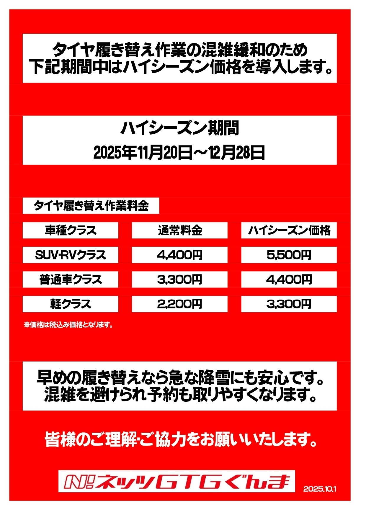 【タイヤ履き替え】ハイシーズン価格導入のお知らせ