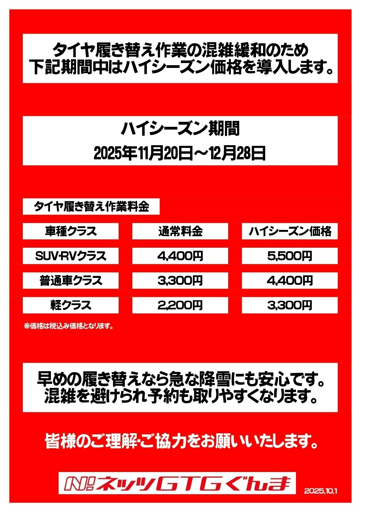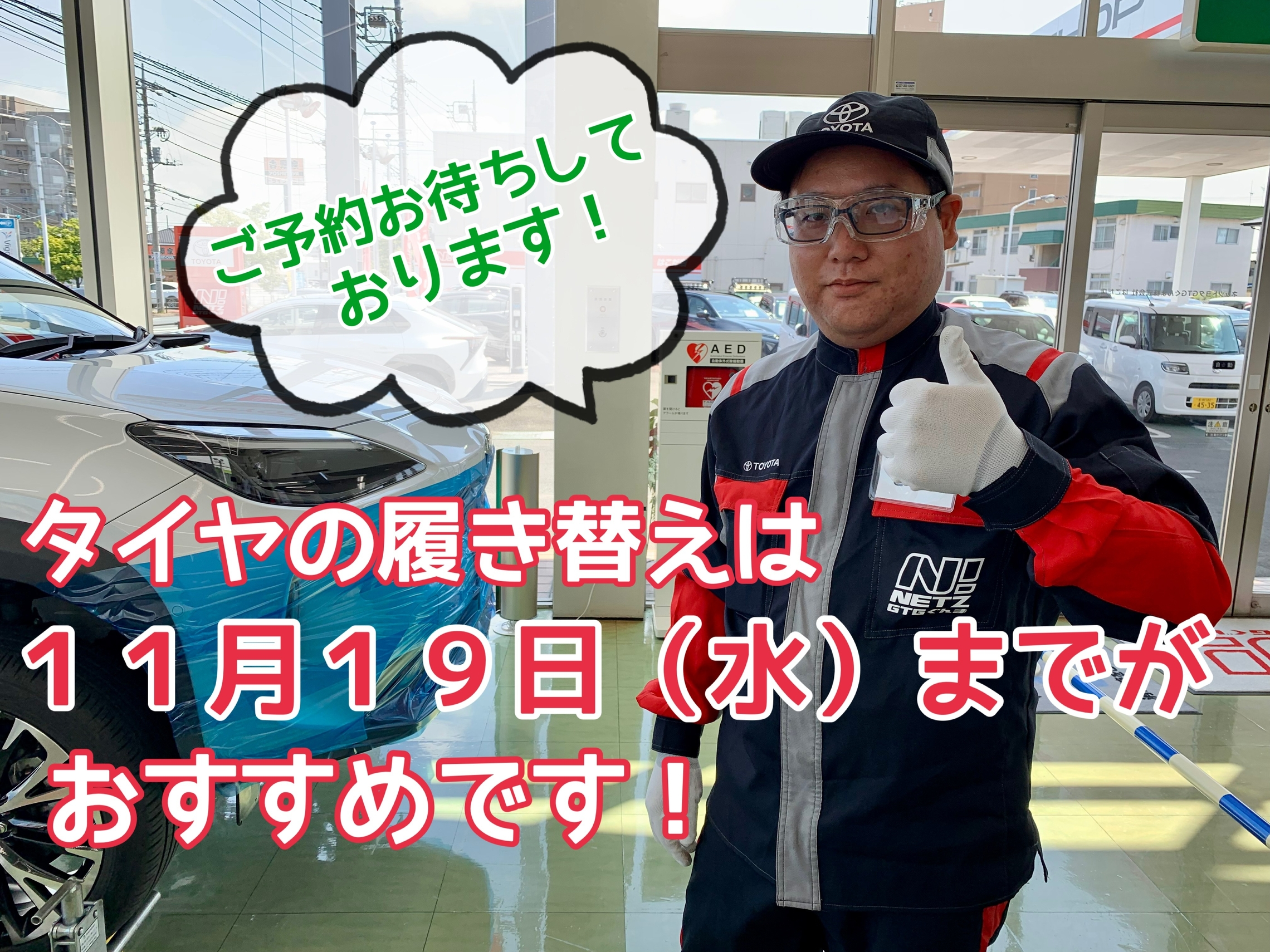 タイヤ履き替え、11月20日㊍よりハイシーズン価格となります🙇♀️