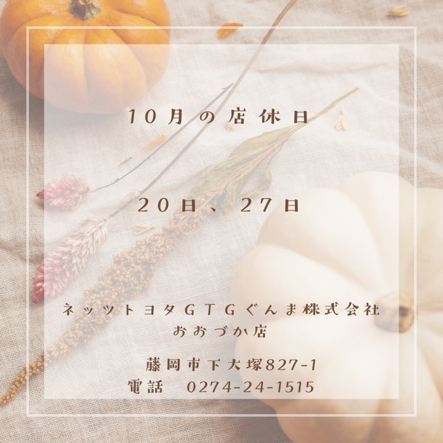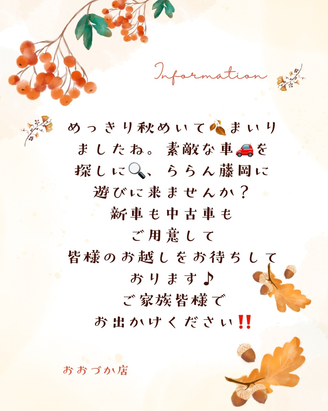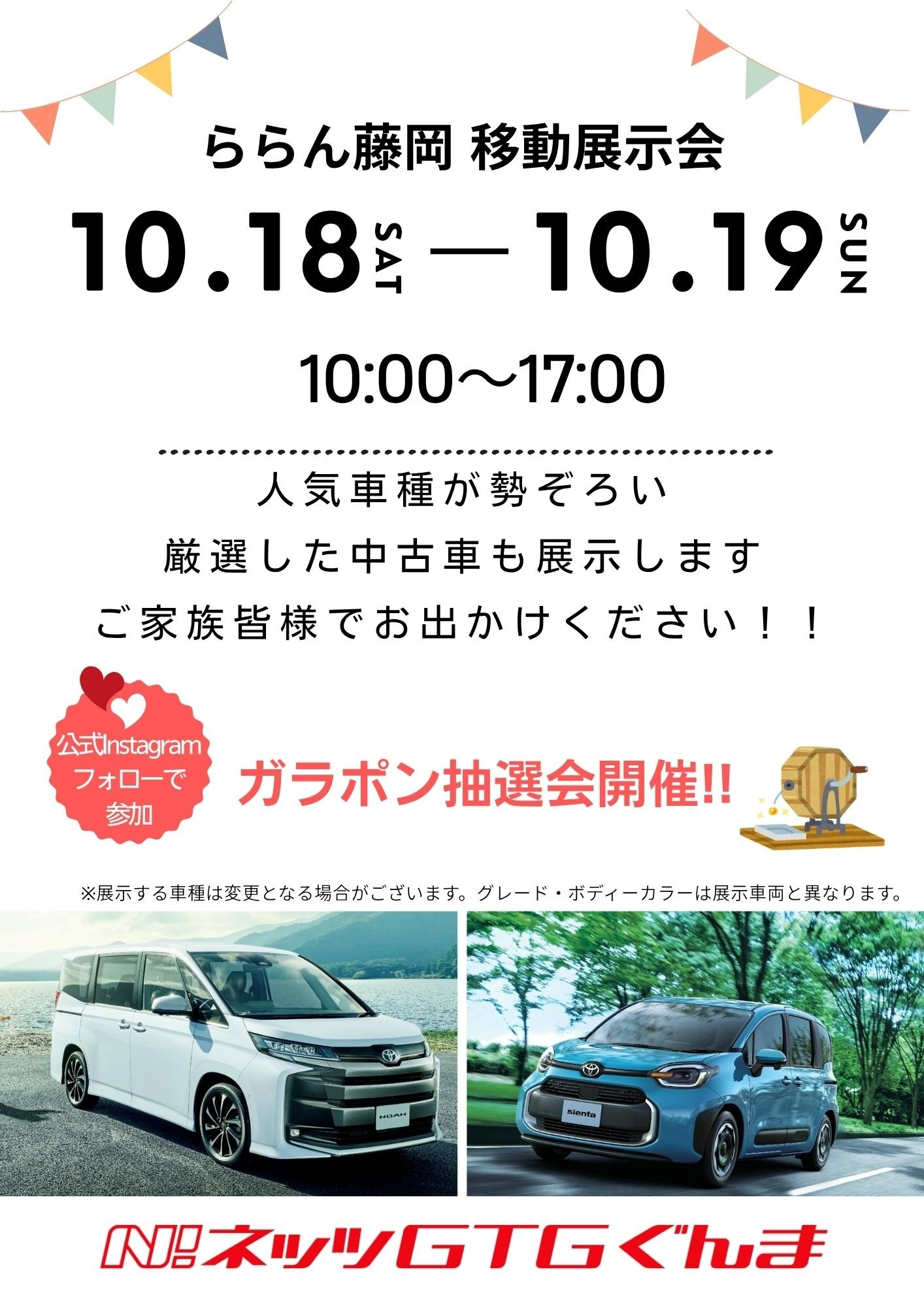 🎡🎢🎠いよいよ今週❕❕ららん藤岡移動展示会開催🚗🚘🚙 2025.10.18 #ららん藤岡移動展示会 ♯おおづか店 #ネッツトヨタGTGぐんま株式会社 いよいよ今週末に、 『ららん藤岡移動展示会』 開催です♪🚙🚙🚙 藤岡のHotspot ららん藤岡に 遊びに来てください♪ ご家族揃って♪🚙🚙🚙 心より お待ちしております。 前の記事へ 店舗ブログ一覧に戻る 次の記事へ