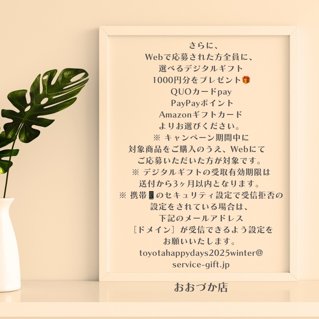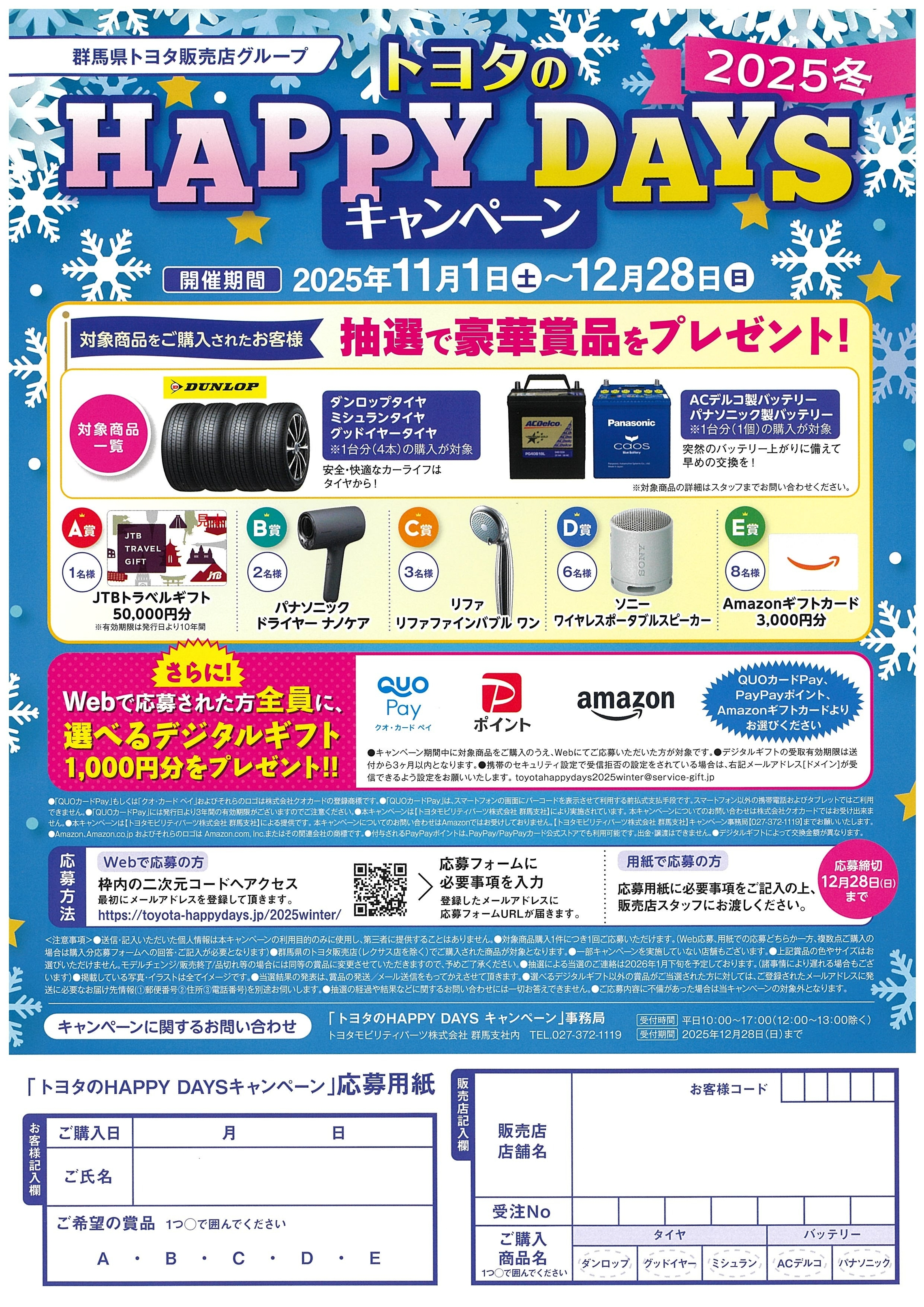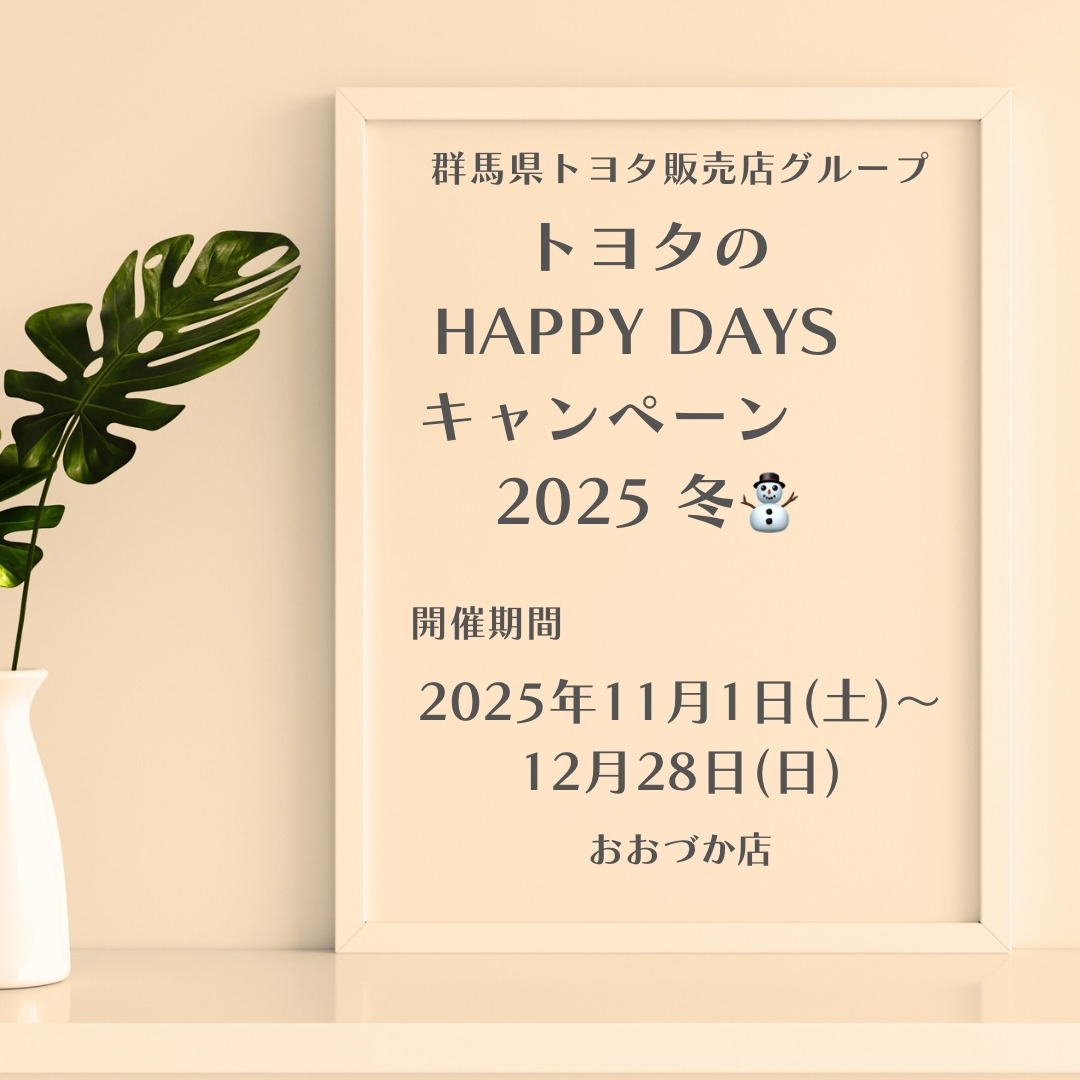 ⛄⛄⛄トヨタのHAPPYDAYSキャンペーン⛄⛄⛄2025冬⛄ 2025.11.26 #ネッツトヨタGTGぐんま株式会社 ♯おおづか店 #HAPPYDAYSキャンペーン めっきり 冷え込んできましたね。 暖かくして 体調崩さないように 気を付けましょう♪ 🎁🚗🚘🚙🎁🚗🚘🚙 素敵なキャンペーンが 始まっておりますよ♪ 詳しくは、 スタッフまで。 お気軽に お声掛けください♪ 今度の週末は、 お店に お立ち寄りください♪ 心より お待ちしております。 前の記事へ 店舗ブログ一覧に戻る 次の記事へ