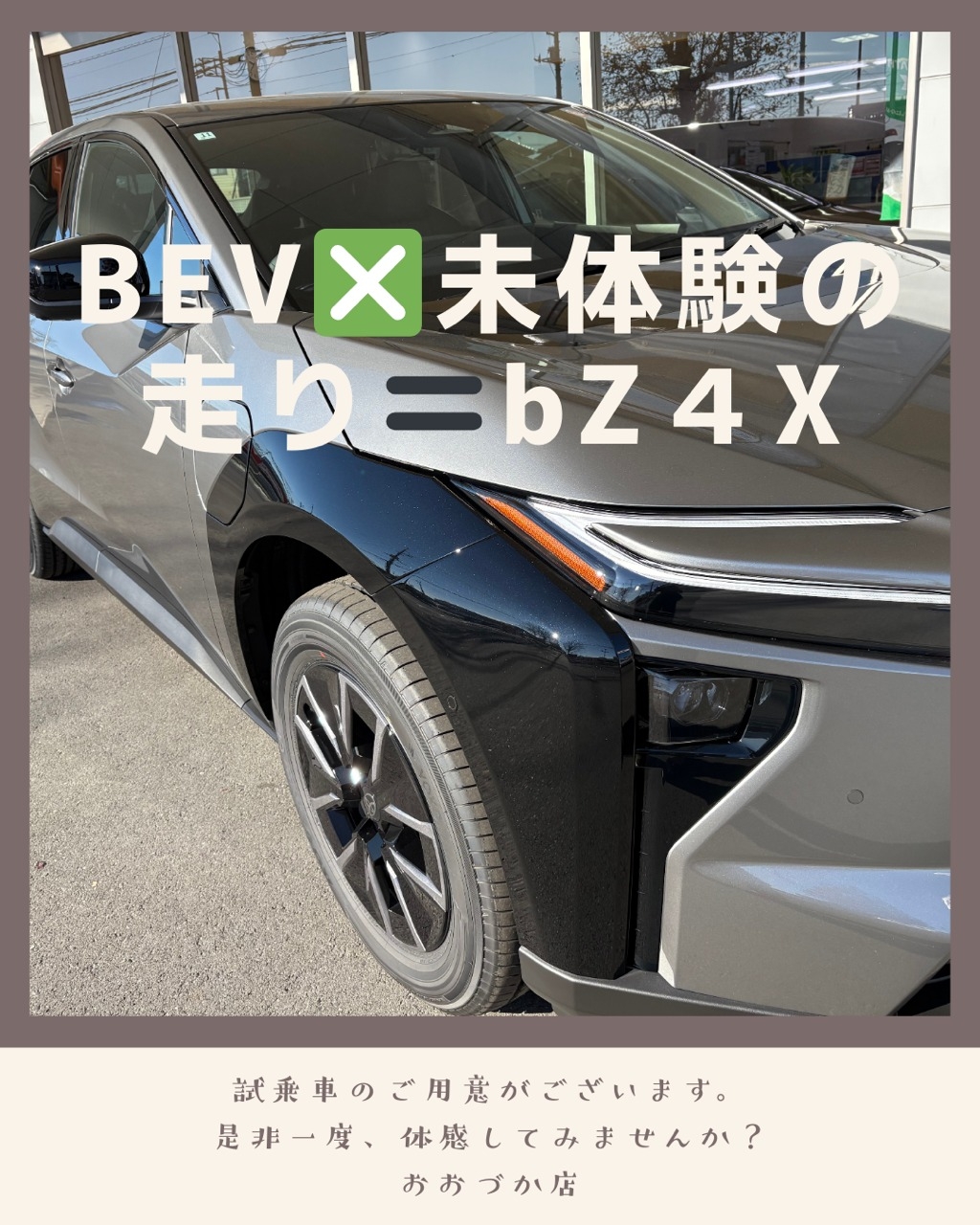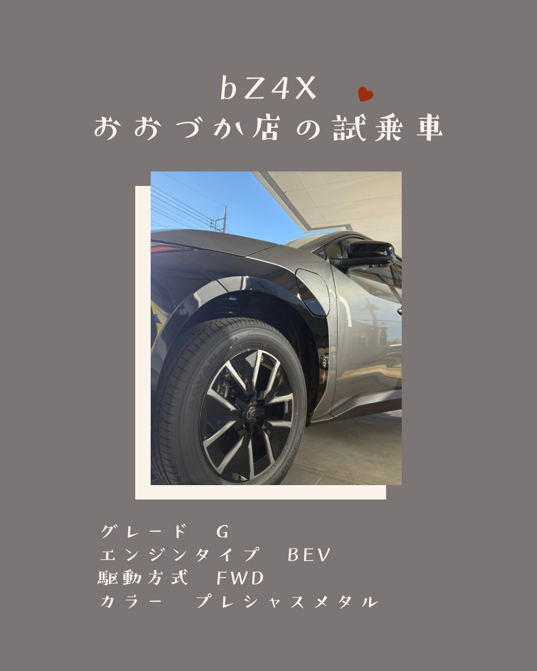 🚗🚘🚙bz4x試乗車ご用意しております♪🚗🚘🚙 2026.01.14 #bZ4X ♯おおづか店 #bev 風が冷たいですね。 暖かくして 過ごしましょう♪ 🐴🐴🐴🐴🐴🐴🐴🐴 本日は、とても素敵な 自動車のご紹介を させていただきます。 詳しくは、スタッフまで。 お気軽に お声掛けください♪ 🚗🚘🚙🚗🚘🚙🚗🚘🚙 電気自動車の加速感を 是非一度 体感して くださいませ。 皆様のご来店を 心より お待ちしております。 前の記事へ 店舗ブログ一覧に戻る 次の記事へ