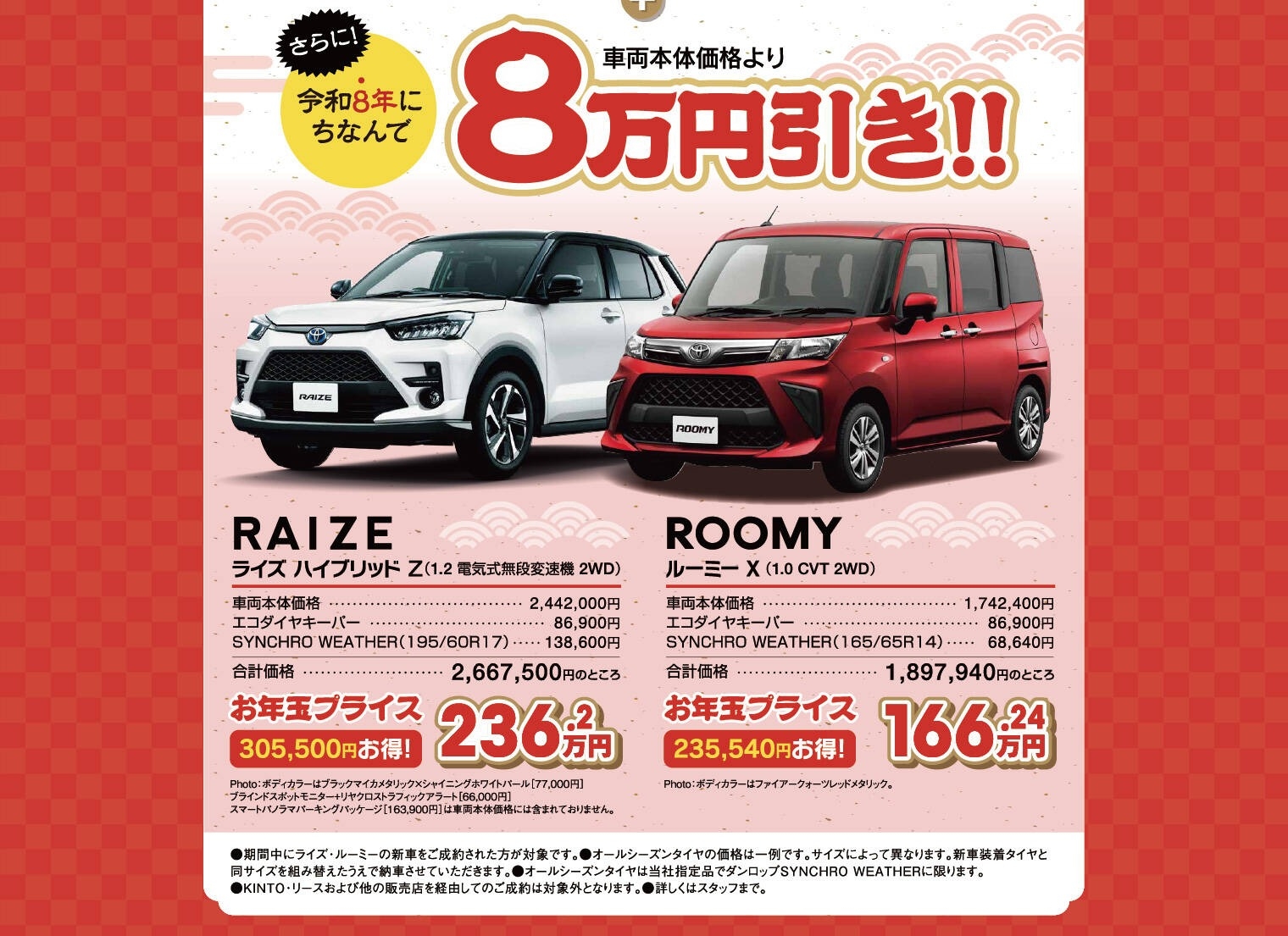 〇自動車リサイクル法施行により、リサイクル料金が別途必要となります。〇車両本体価格(消費税込)はパンク応急修理キット付の価格です。〇車両本体価格にはオプションは含まれません。〇保険料、税金(除く消費税)、登録などの諸費用は別途申し受けます。